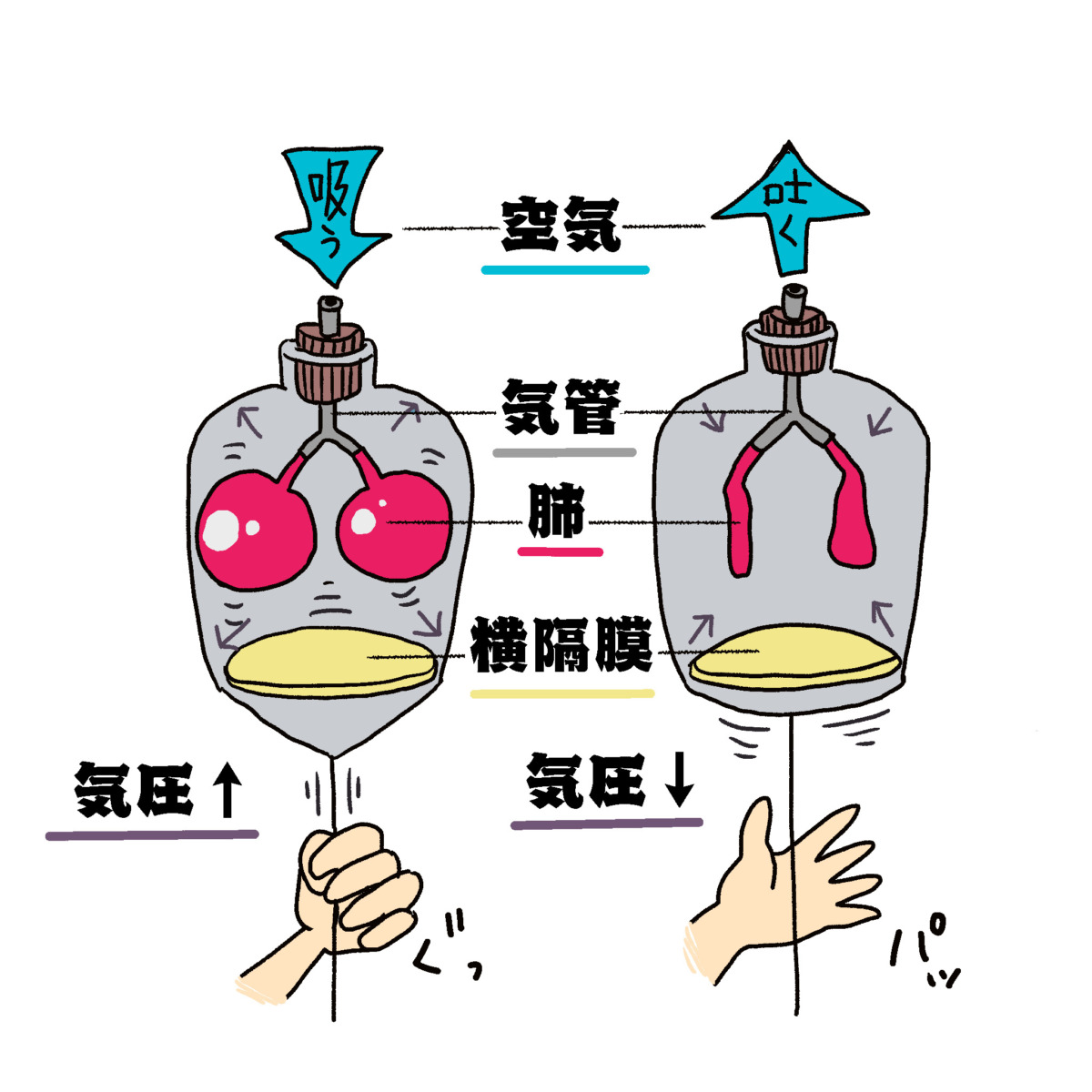 呼吸と聞いて思い浮かべる鼻や口からの空気の出入りは「換気」と言います。生理学的には空気中から酸素を取り入れ、細胞の代謝によって生じた二酸化炭素を排出するガス交換を「呼吸」といいます。