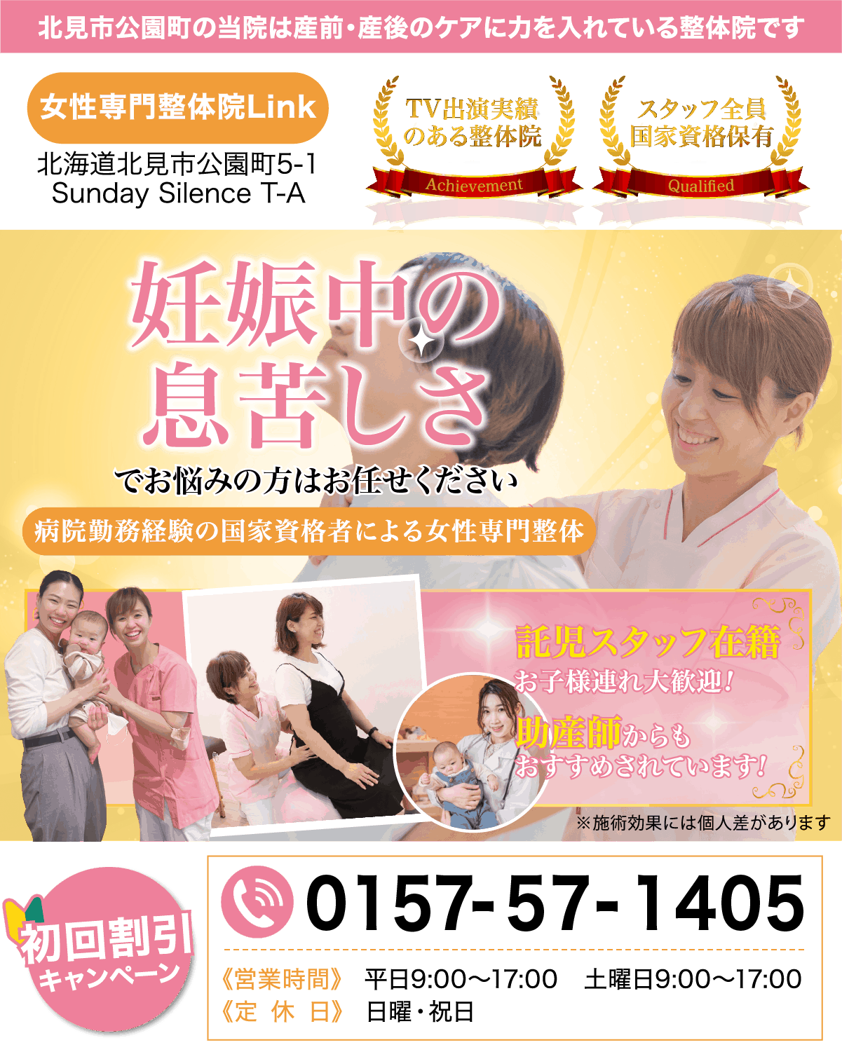 妊娠・出産・子育て期の女性をサポート。オホーツクの頼れる女性専門整体院です。