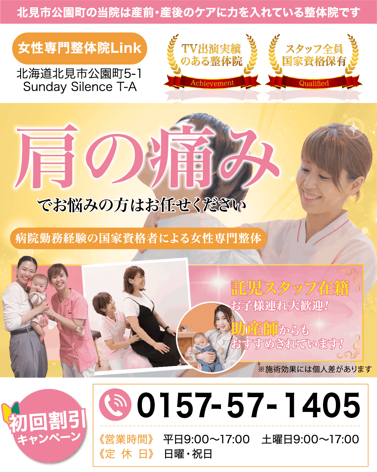 女性専門整体院Link北見店のホームページへお越しいただきありがとうございます。Link北見店は、北海道北見市公園町に位置する女性専用の整体院です。肩こり、腰痛、膝の痛みなどの症状から、女性特有の悩みまで幅広く対応しています。国家資格を持つ施術者が、医療機関での勤務経験と知識を活かし、安全で効果的な施術を提供いたします。